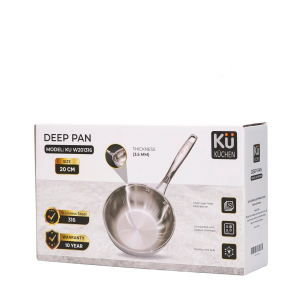 1) General Introduction The KUCHEN KU W201316 is a premium deep stainless steel pan designed for modern kitchens. With a diameter of 20 cm, height of 7.5 cm, and body & base thickness of 3.5 mm, it ensures stable heat conduction and retention, preventing warping under high temperatures. Perfect for everyday frying, sautéing, and searing, as well as professional cooking needs.